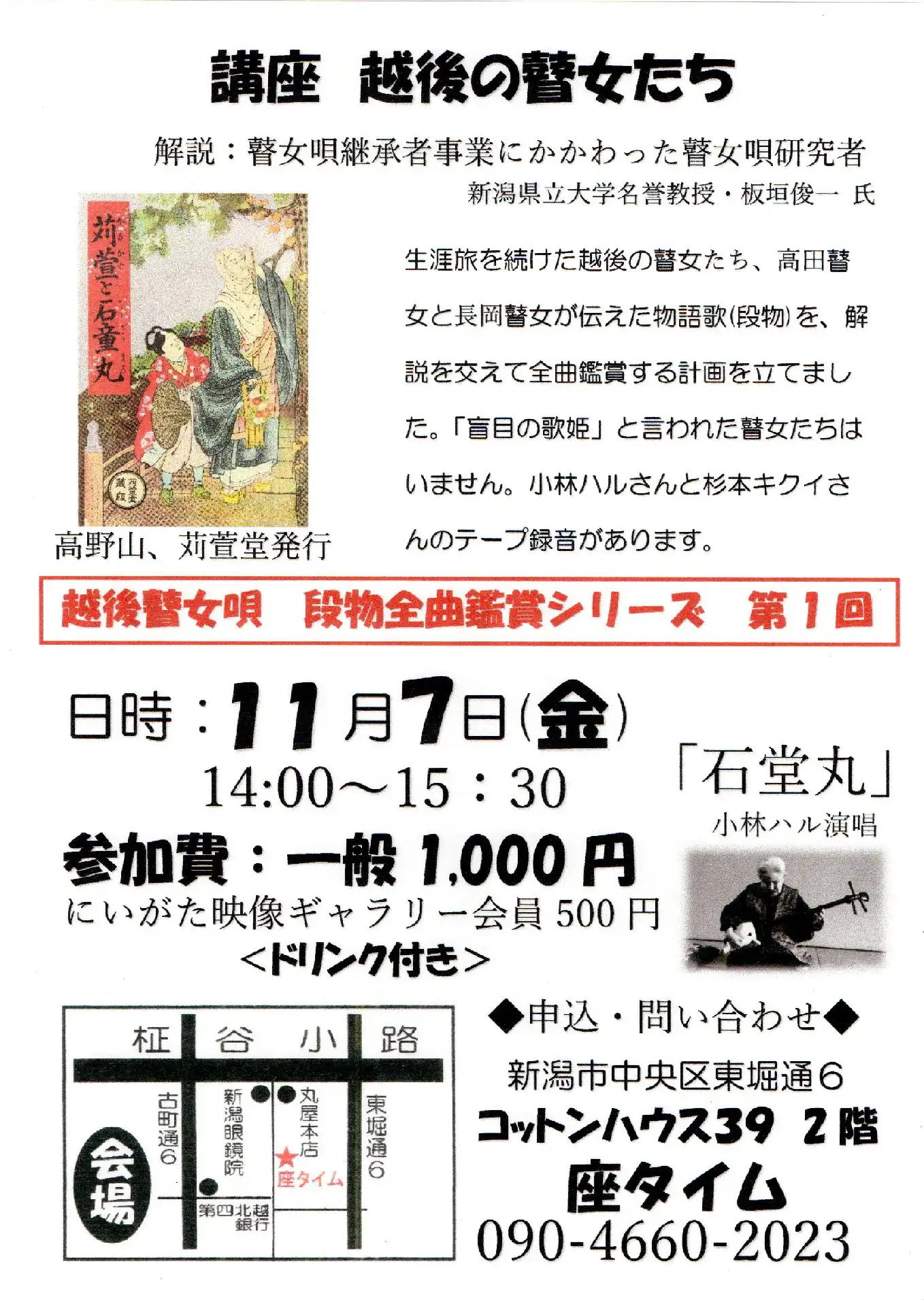 女と長岡瞽女が伝えた物語歌(段物)を、解説を交えて全曲鑑賞する計画を立てました。「盲目の歌姫」と言われた瞽女たちはいません。小林ハルさんと杉本キクイさ